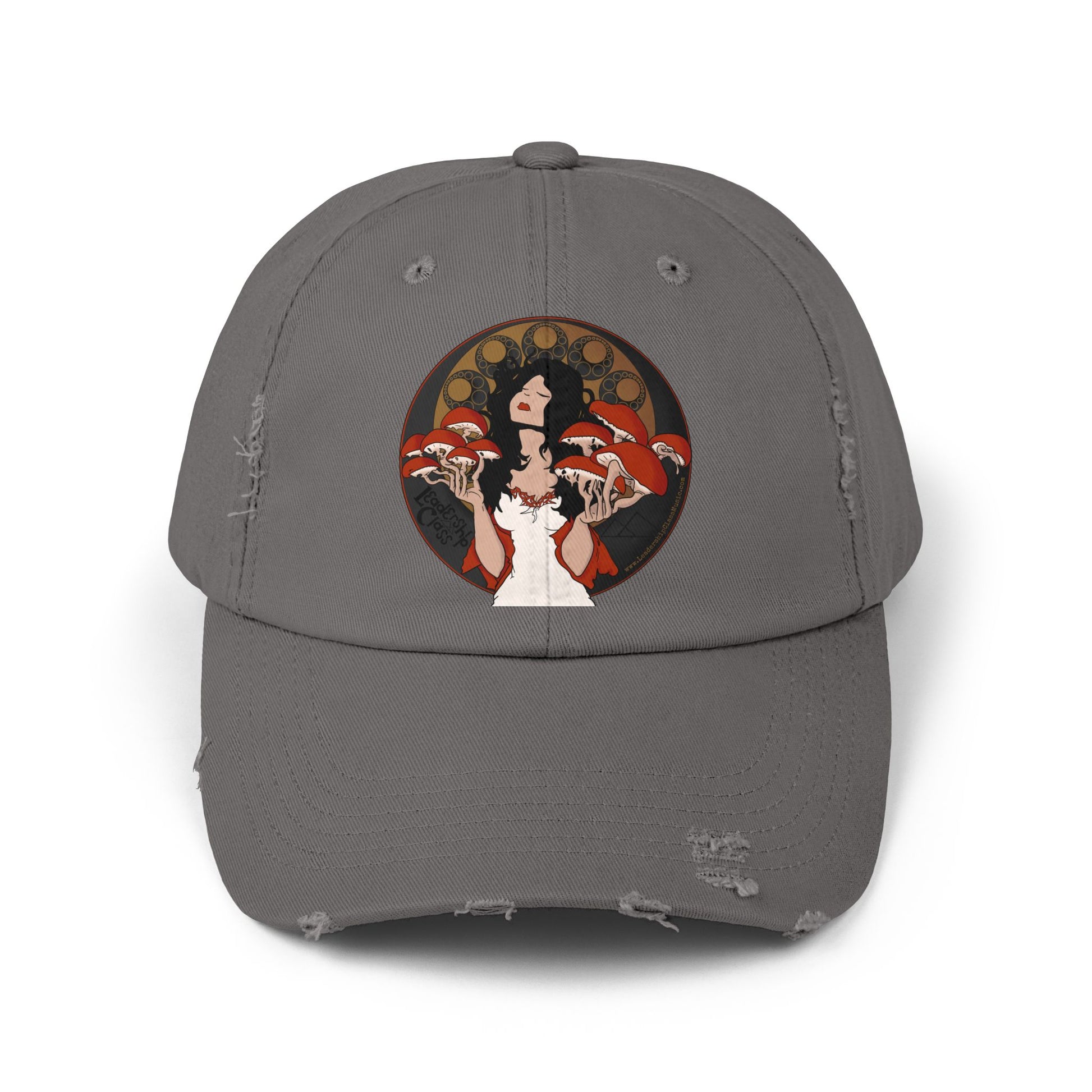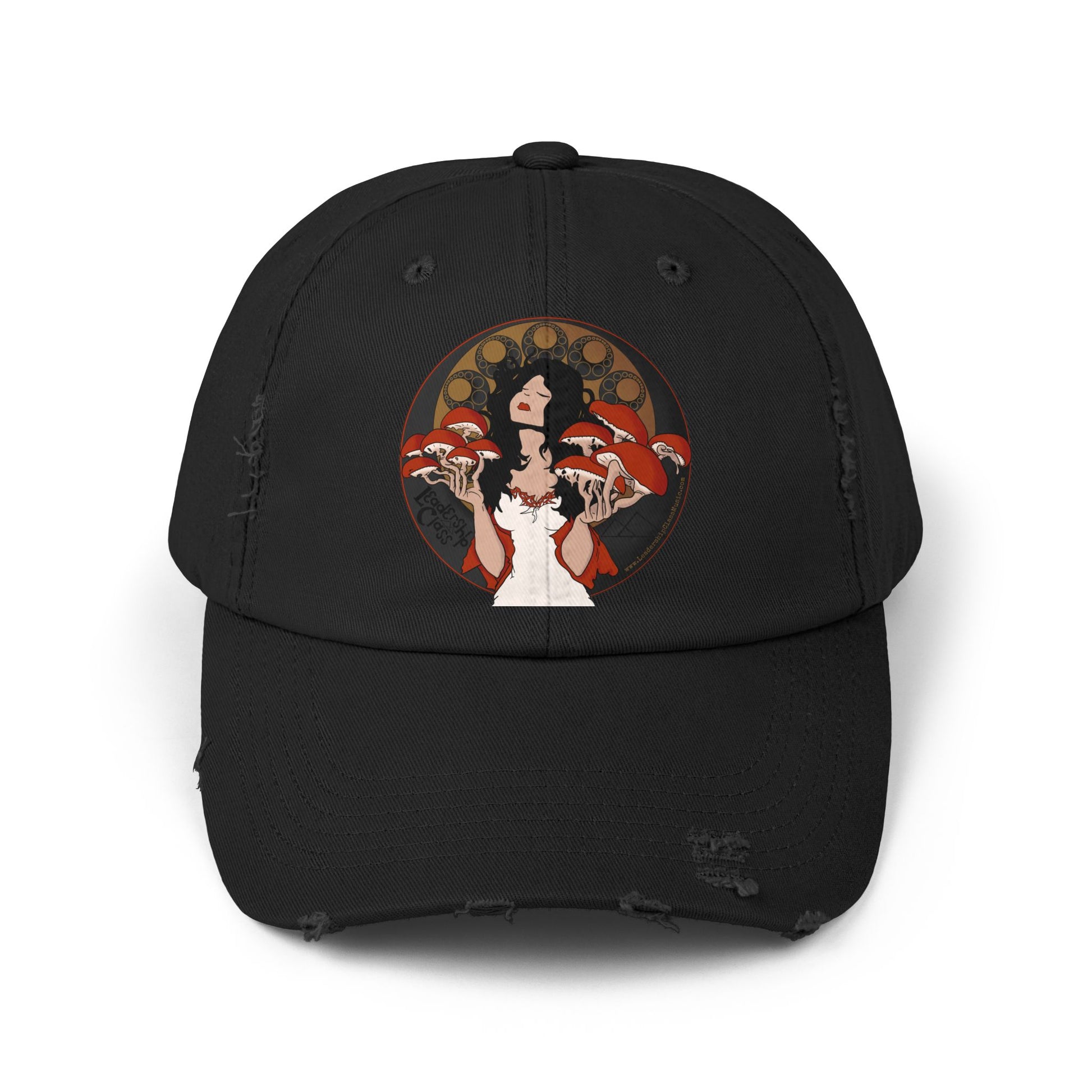 This distressed cap features a unique logo design called The Mystique of Mycelium for the alt rock band Leadership Class, with a woman whose fingers are turning into mushrooms. The vintage look and feel of the 100% cotton twill material, along with the comfortable fit and distressed elements, make it perfect for everyday wear. Ideal for fans of Leadership Class and those who appreciate alternative rock vibes.