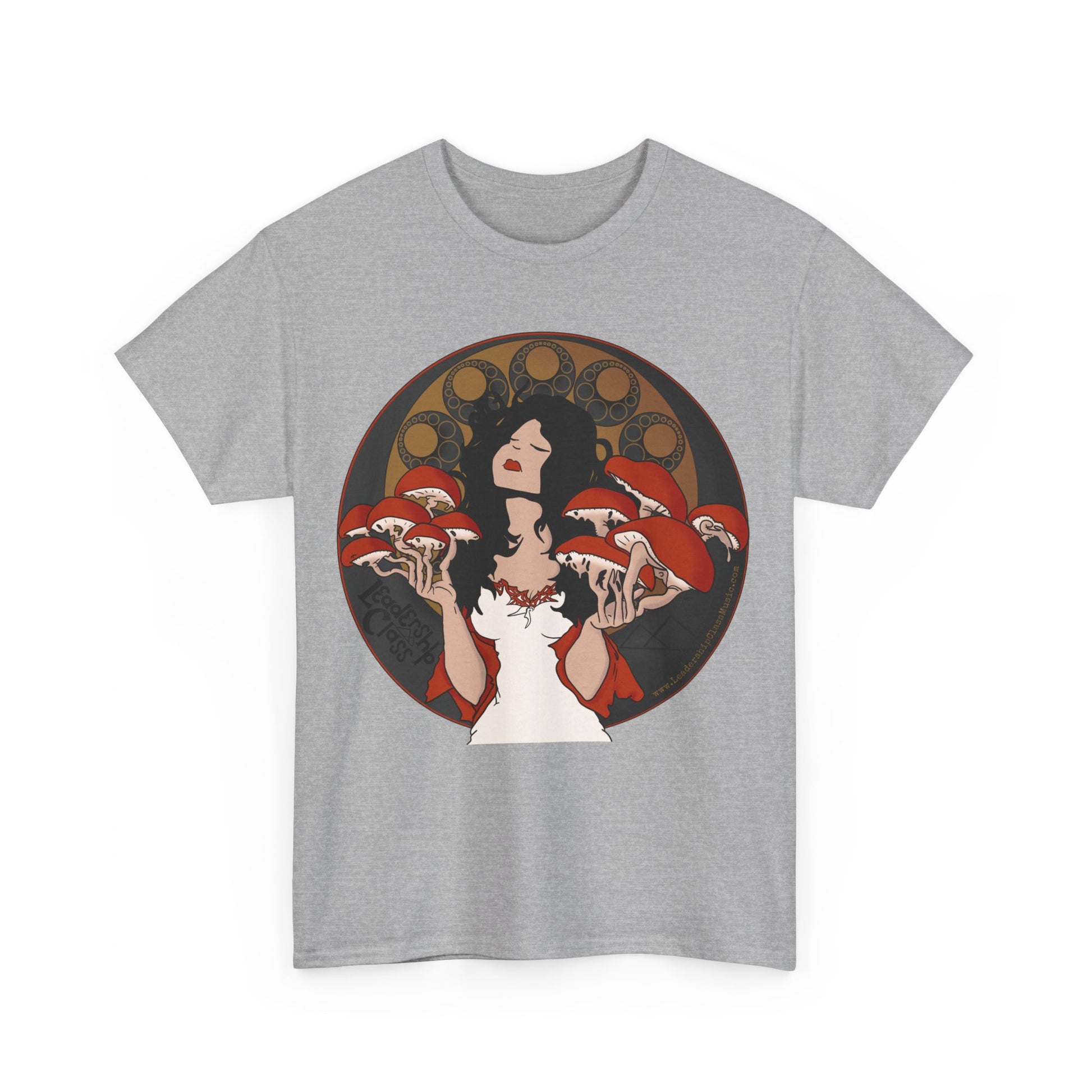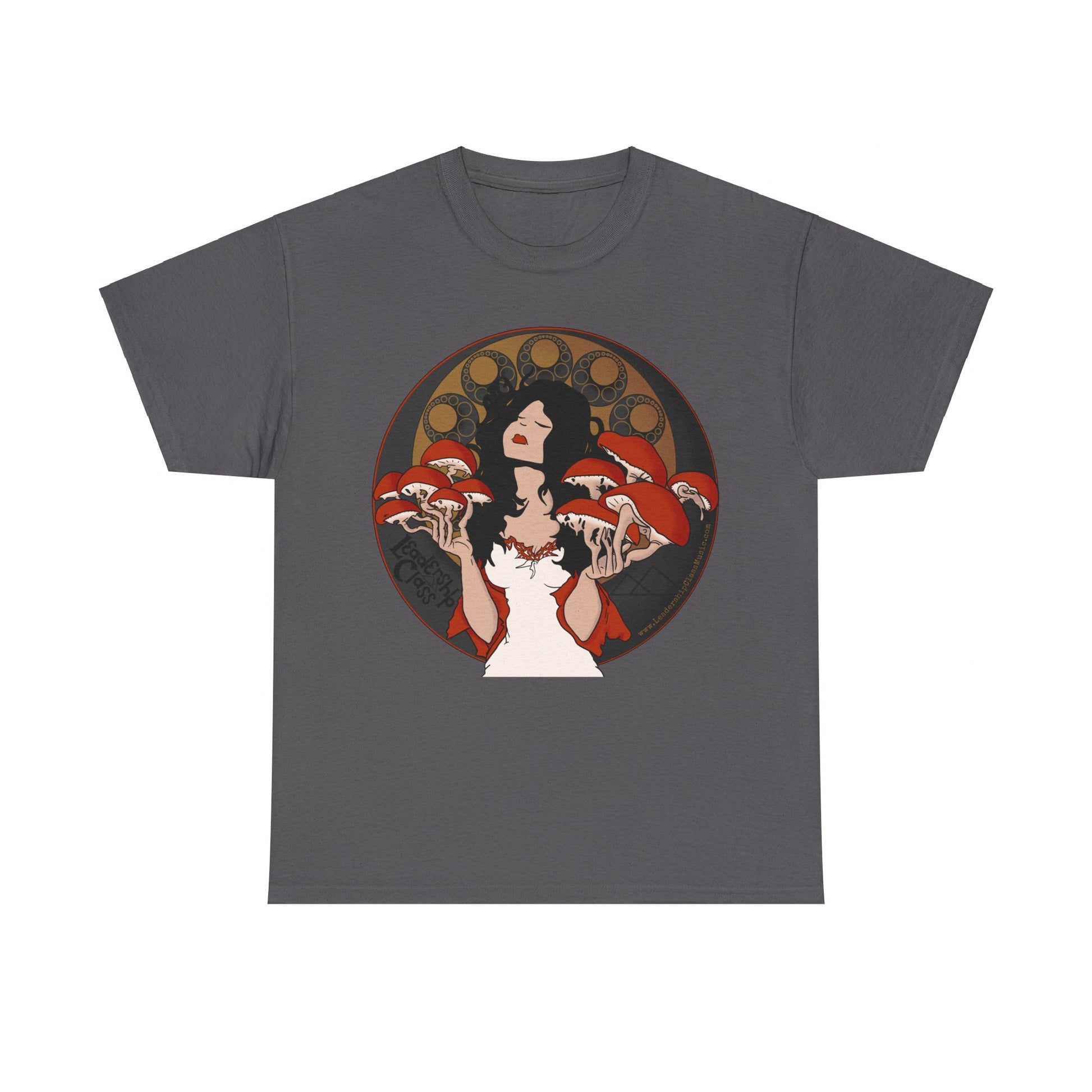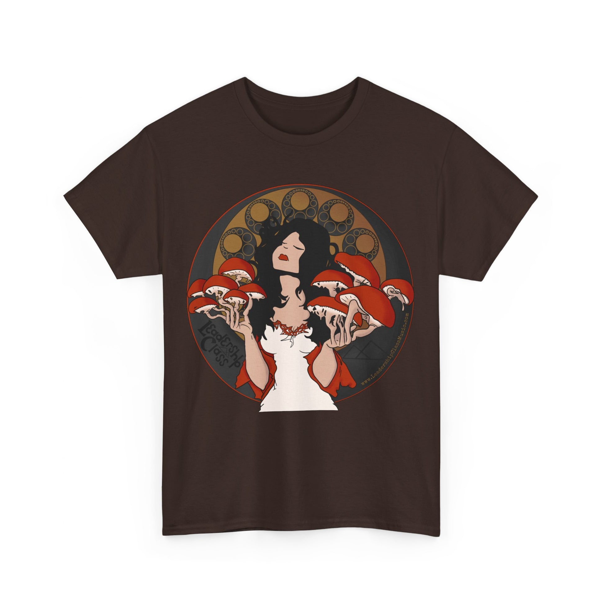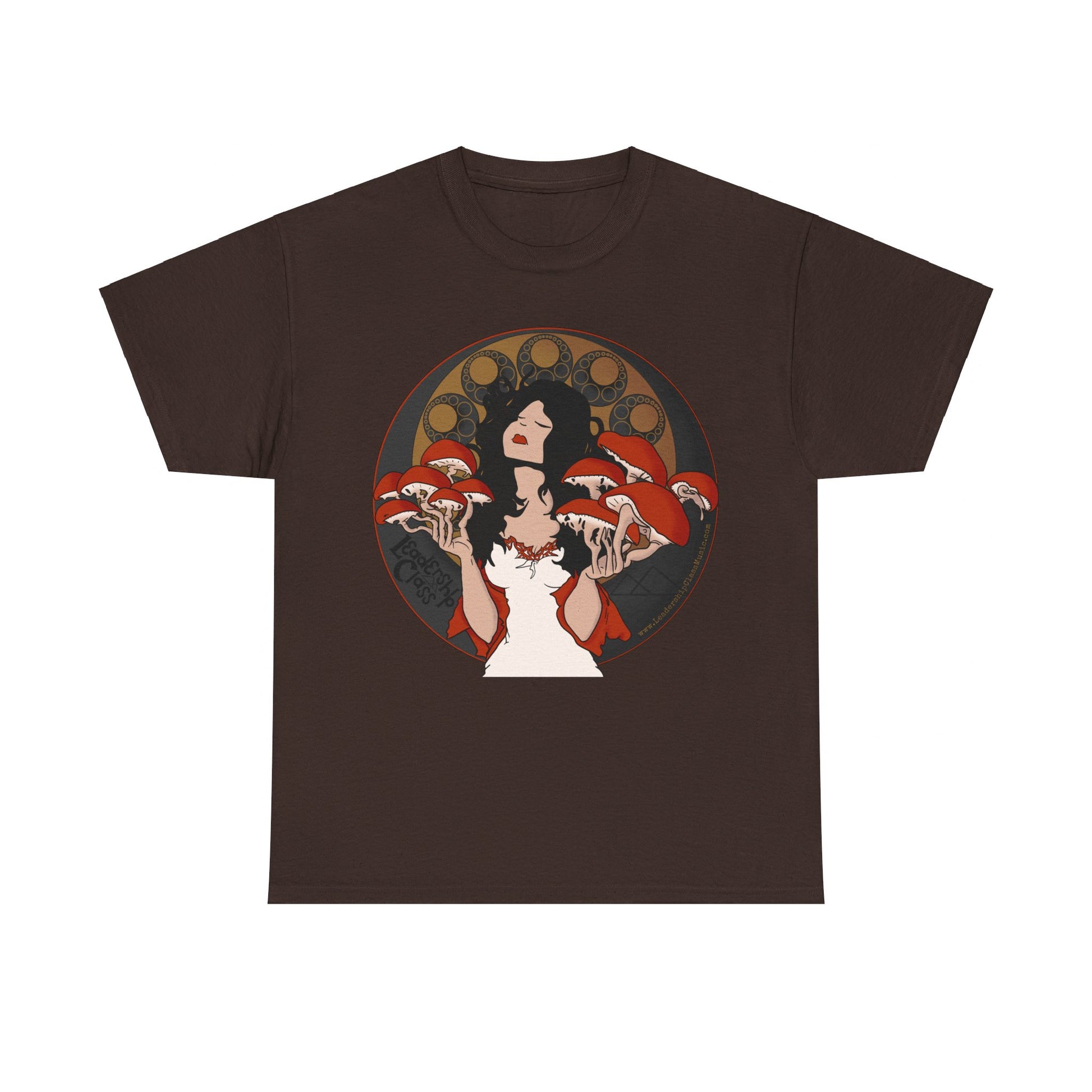 Immerse yourself in the enigmatic allure of the forest with Leadership Class's 'Mystique of Mycelium' t-shirt. This exclusive design features an ethereal lady enshrined by an intricate halo of mushrooms, evoking a connection with nature's untamed spirit. Her delicate pose and the subtle interplay of earthy tones against the shirt’s dark fabric create a mesmerizing tableau that's both mystical and grounded.