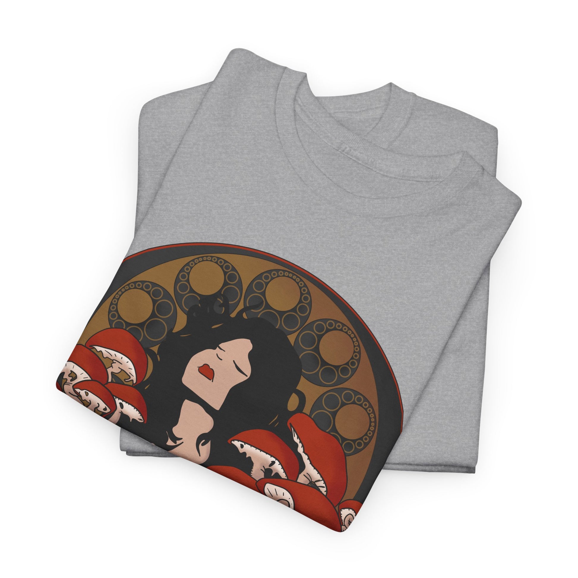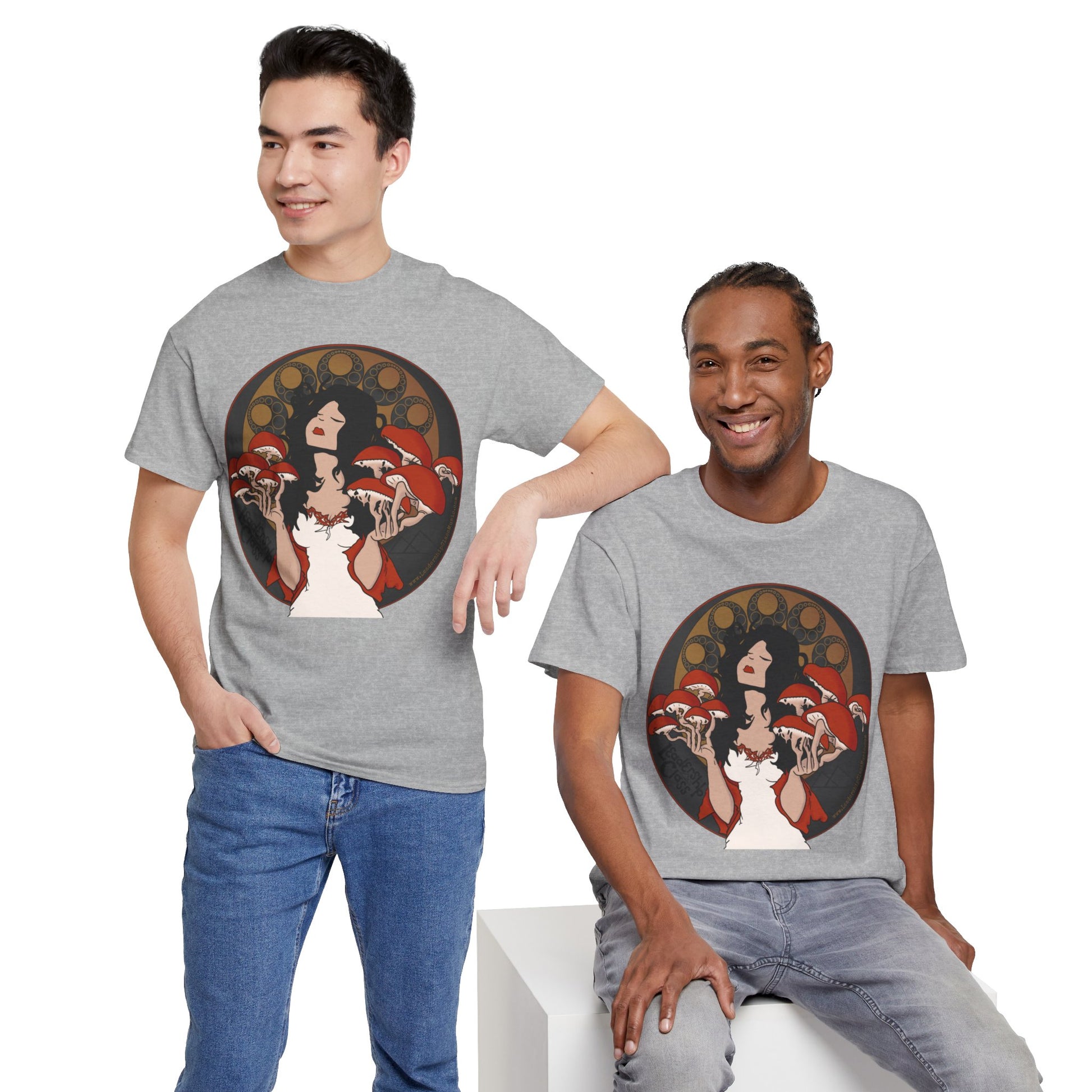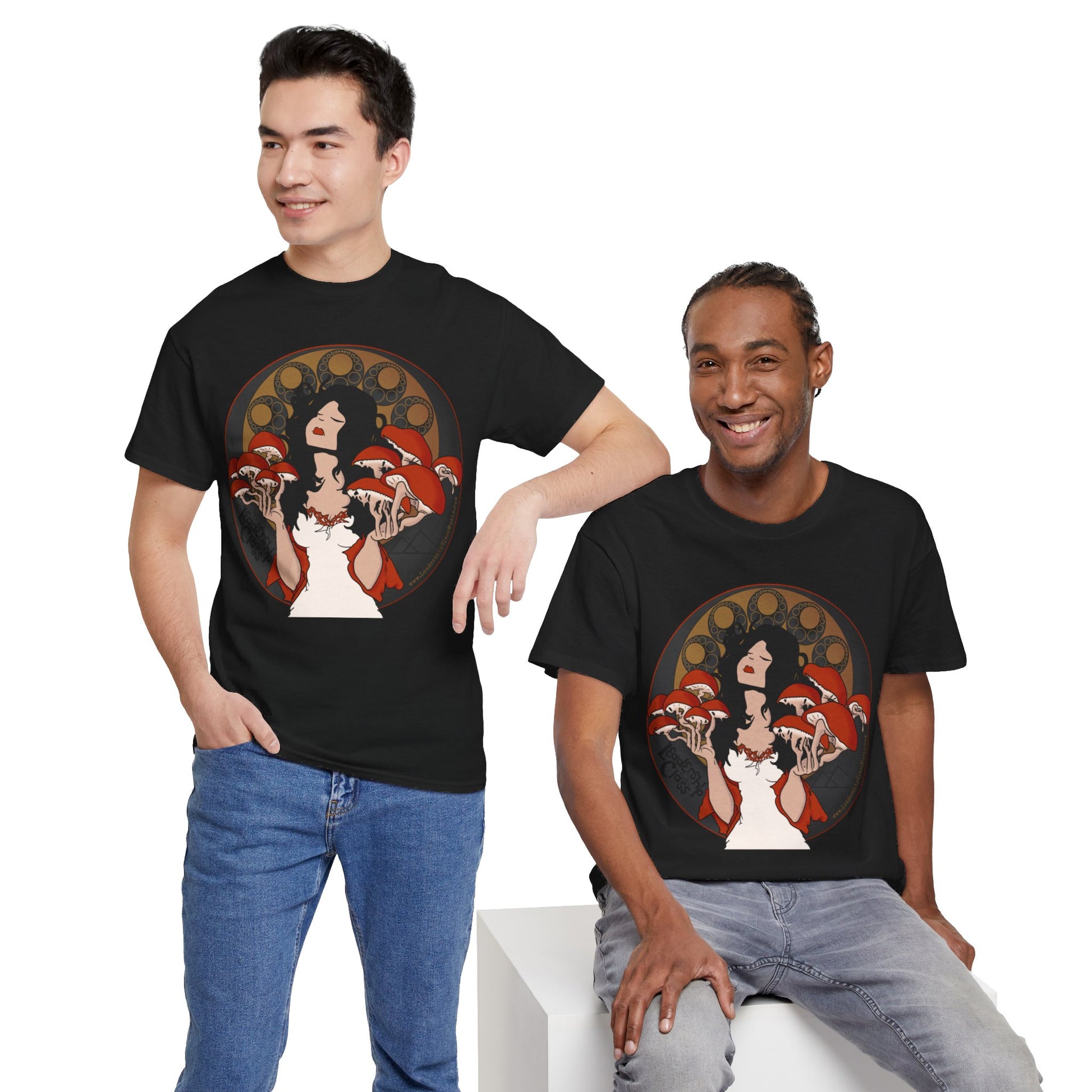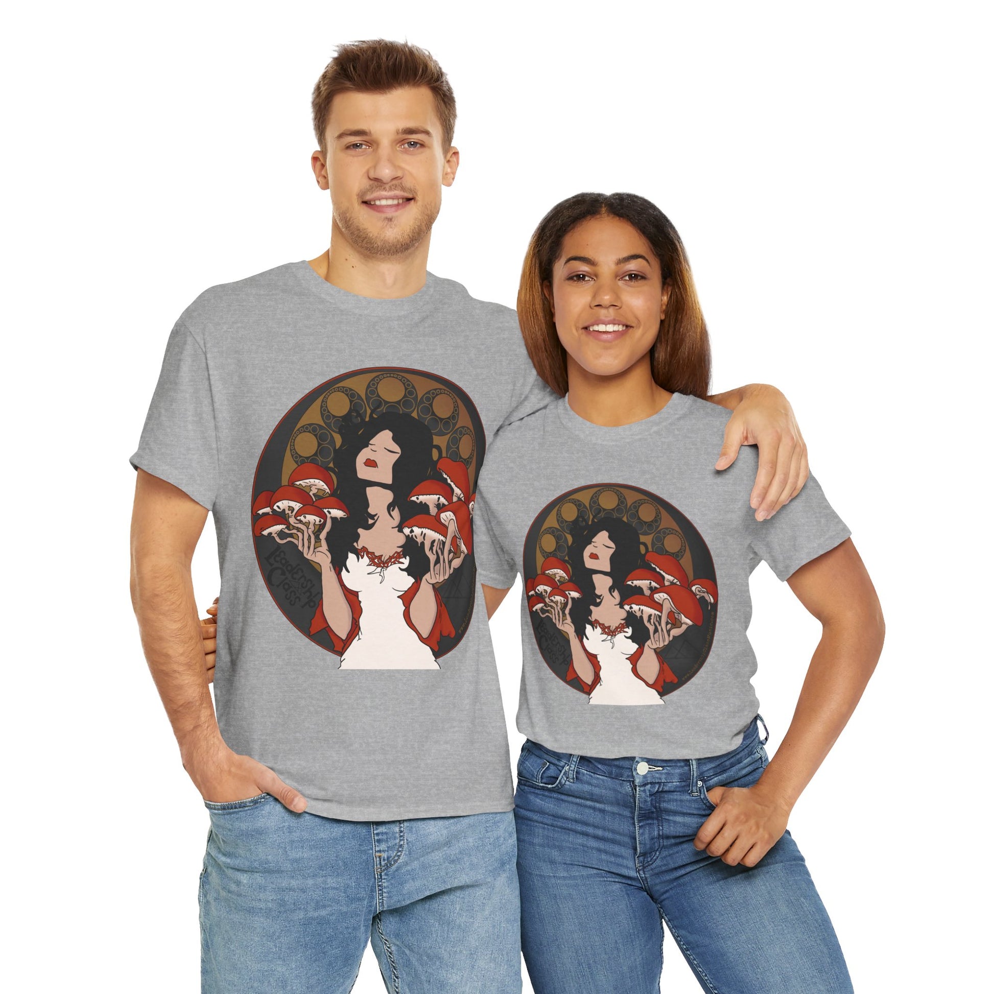 Immerse yourself in the enigmatic allure of the forest with Leadership Class's 'Mystique of Mycelium' t-shirt. This exclusive design features an ethereal lady enshrined by an intricate halo of mushrooms, evoking a connection with nature's untamed spirit. Her delicate pose and the subtle interplay of earthy tones against the shirt’s dark fabric create a mesmerizing tableau that's both mystical and grounded.